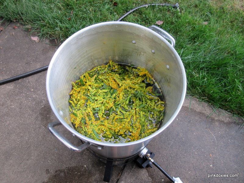 I strained the flower heads out, and allowed the pot to cool a bit. Into it went the fabric which had been kept in water. I fired the propane back up, and started the actual dyeing process finally.